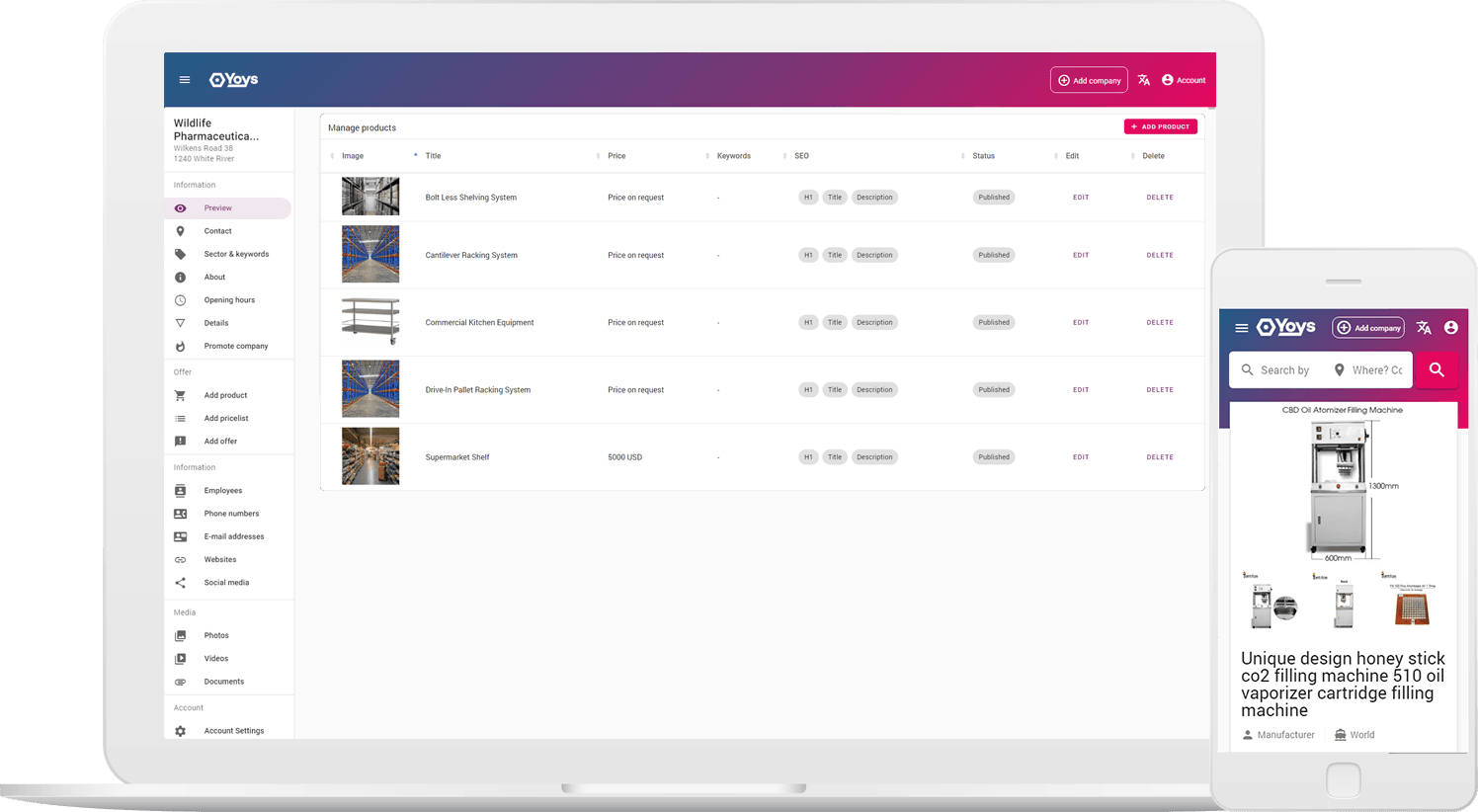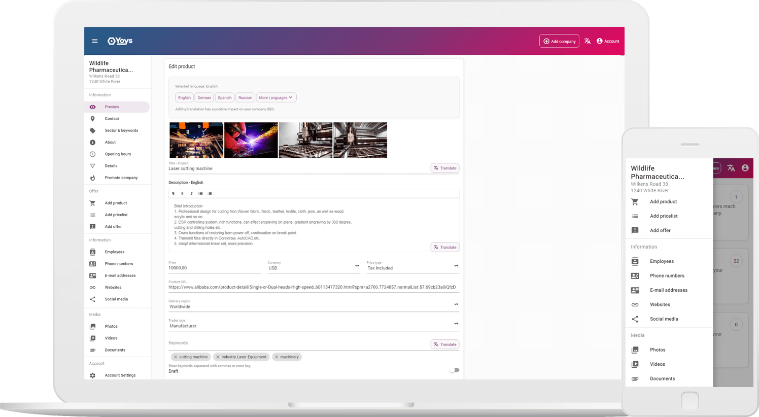 Present your company and your products with pictures, descriptions, videos, certificates and products translated in to 30 languages.
