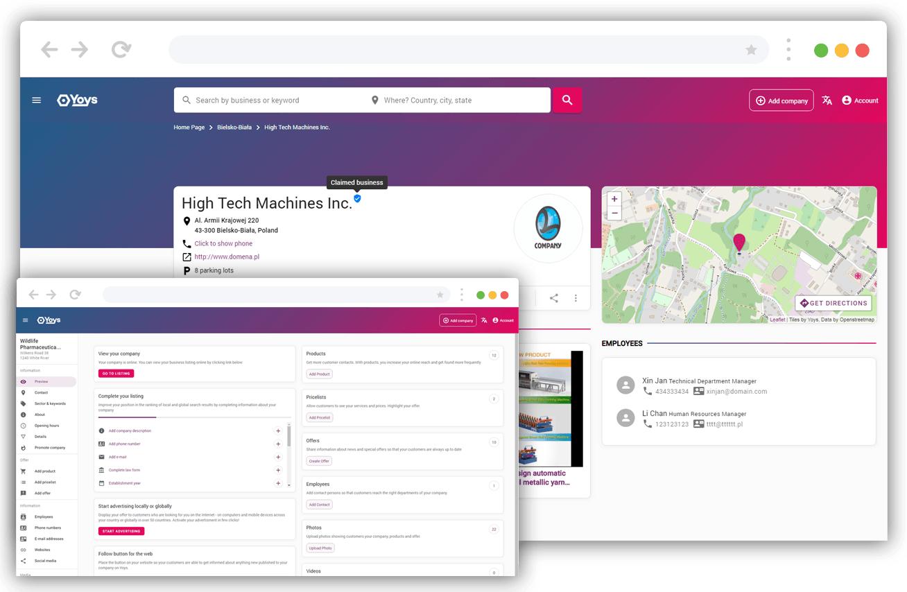 Add and edit your company information for free. Showcase your logo, photos, videos, business description, hours and holiday hours, menus, product & service lists, and more than a dozen other fields alongside your basic name, address, and phone number across more than 40 services in 30 languages.