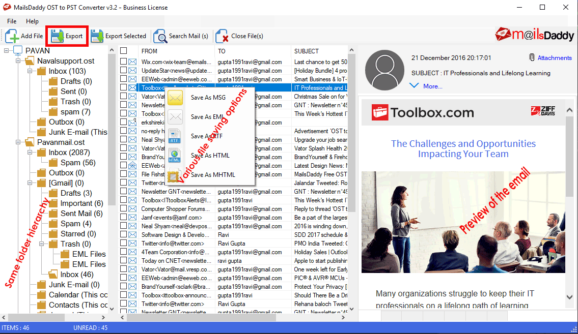 If you are unable to access your OST file databases and want to convert them into Outlook PST file format, download MailsDaddy OST to PST Converter Tool. It is helpful to easily retrieve OST files and then convert them into Microsoft PST file format. Here users can also export OST files into EML, MBOX, MSG, RTF, Live Exchange Server, Office 365, and others. The application is helpful to save OST file contacts into CSV, and calendar details in ICS format. The program enables users to convert heavy offline OST files into small Outlook PST files.