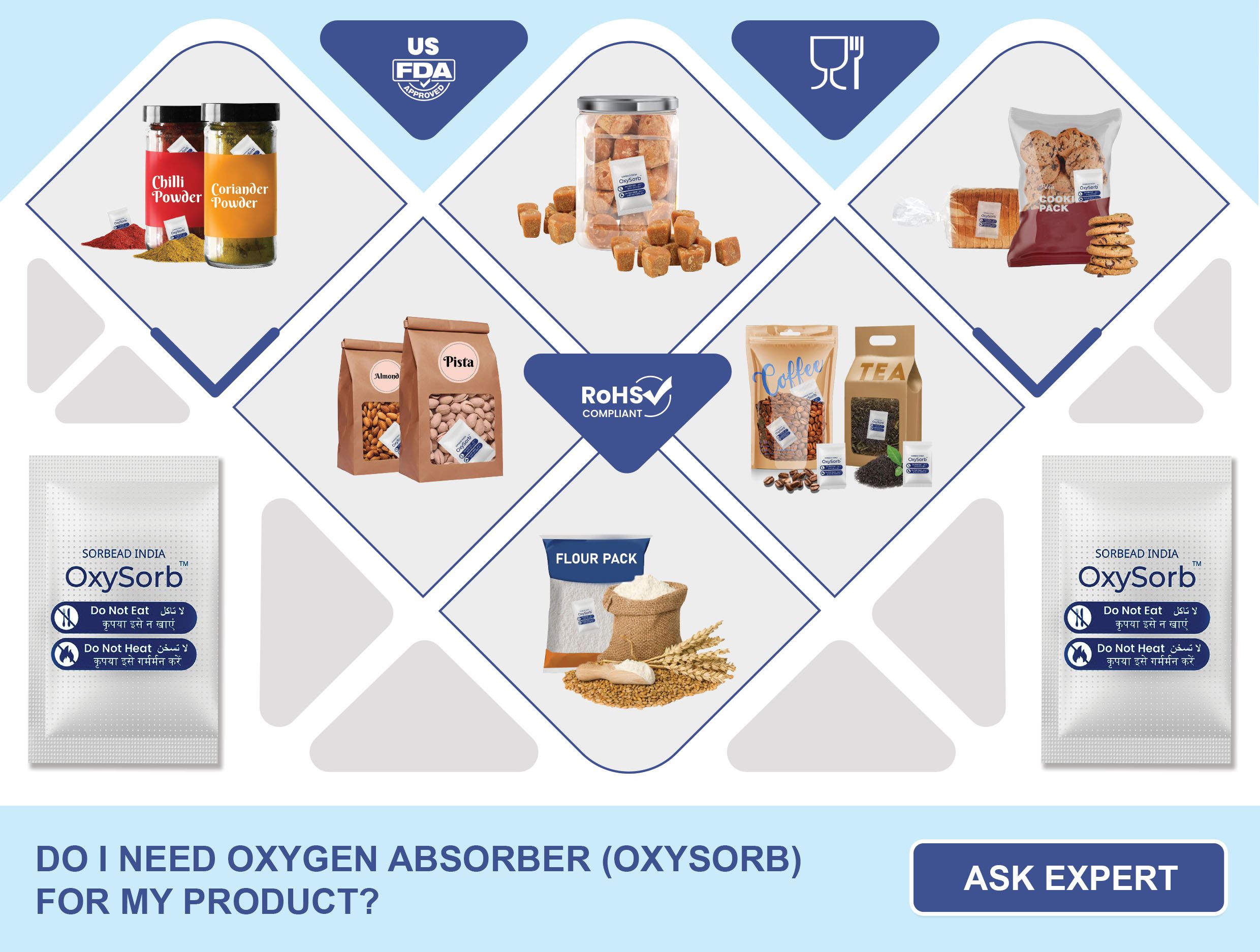 OxySorb - Oxygen Absorbers,” which offers the perfect solution for all packaging issues against the growth of oxygen, the proliferation of bacteria and spoilage, mold, and mildew. Oxygen Absorbers are added to any enclosed packaging aid to remove or decrease the level of oxygen in the package. Sorbead India offers a food-grade oxygen absorber used in vacuum-sealed and manual-sealed packaging. During the flexible or vacuum packaging process, packets or containers are perfectly mouth-filled and properly sealed for the solution of the oxygen-free environment from the packaging.
